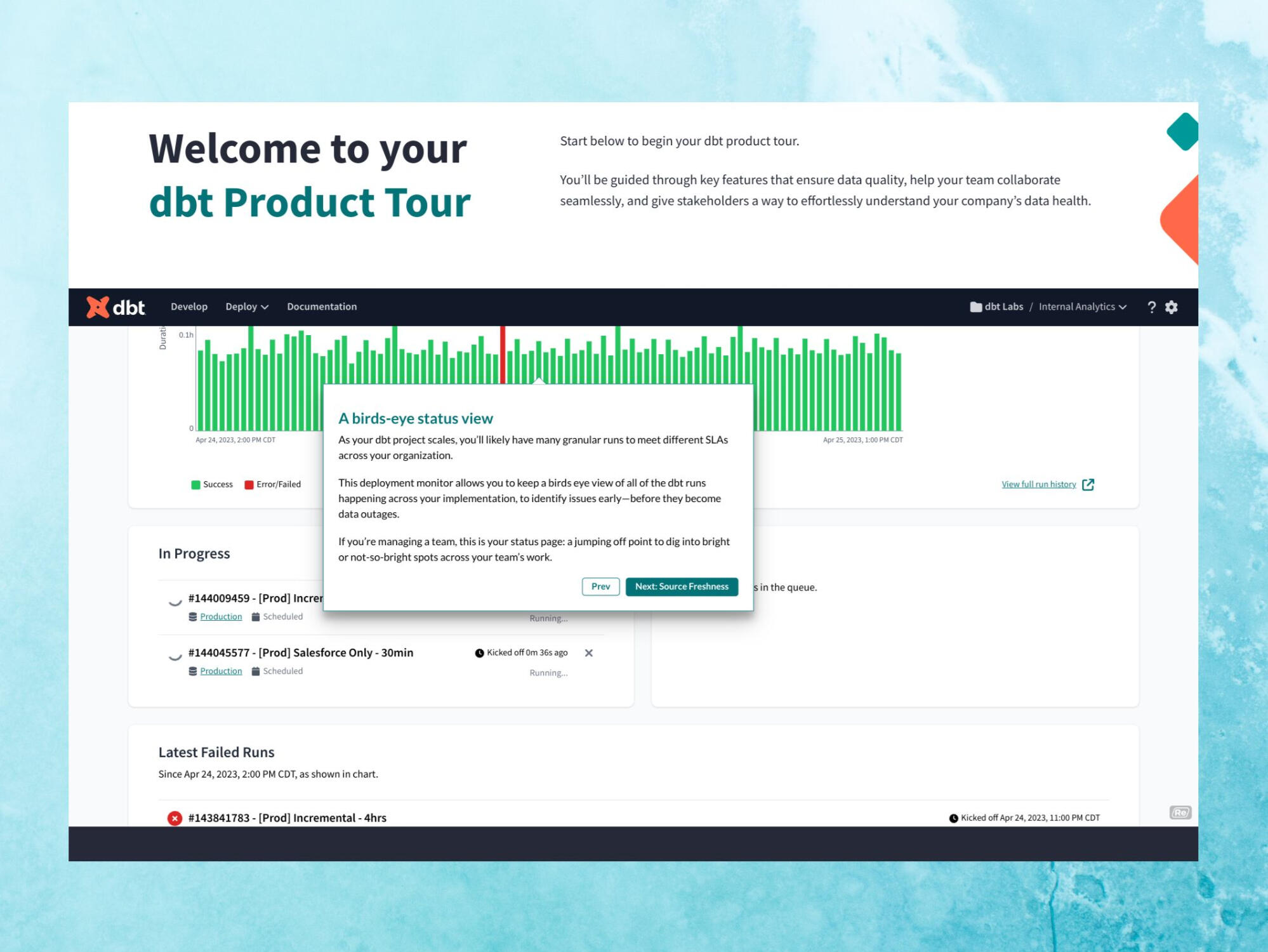 My goal for this project was to bring a content design focus to dbt Labs' newly launched product tour, meeting users where they were and simplifying the tour's messaging.