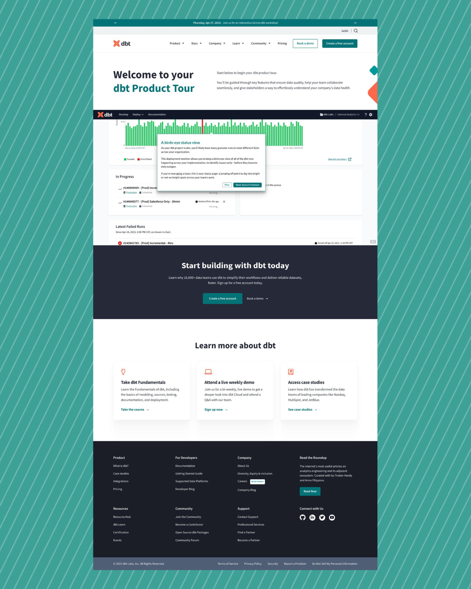 Results:I'm confident that the final product tour was more empathetic and digestible than it's unedited iteration. I also wrote this tour's landing page, confirmation page, and several follow-up emails, creating a more cohesive experience dbt's users.I believe that great UX provides value and clarity, and it was wonderful to contribute my content design perspective to this project.
