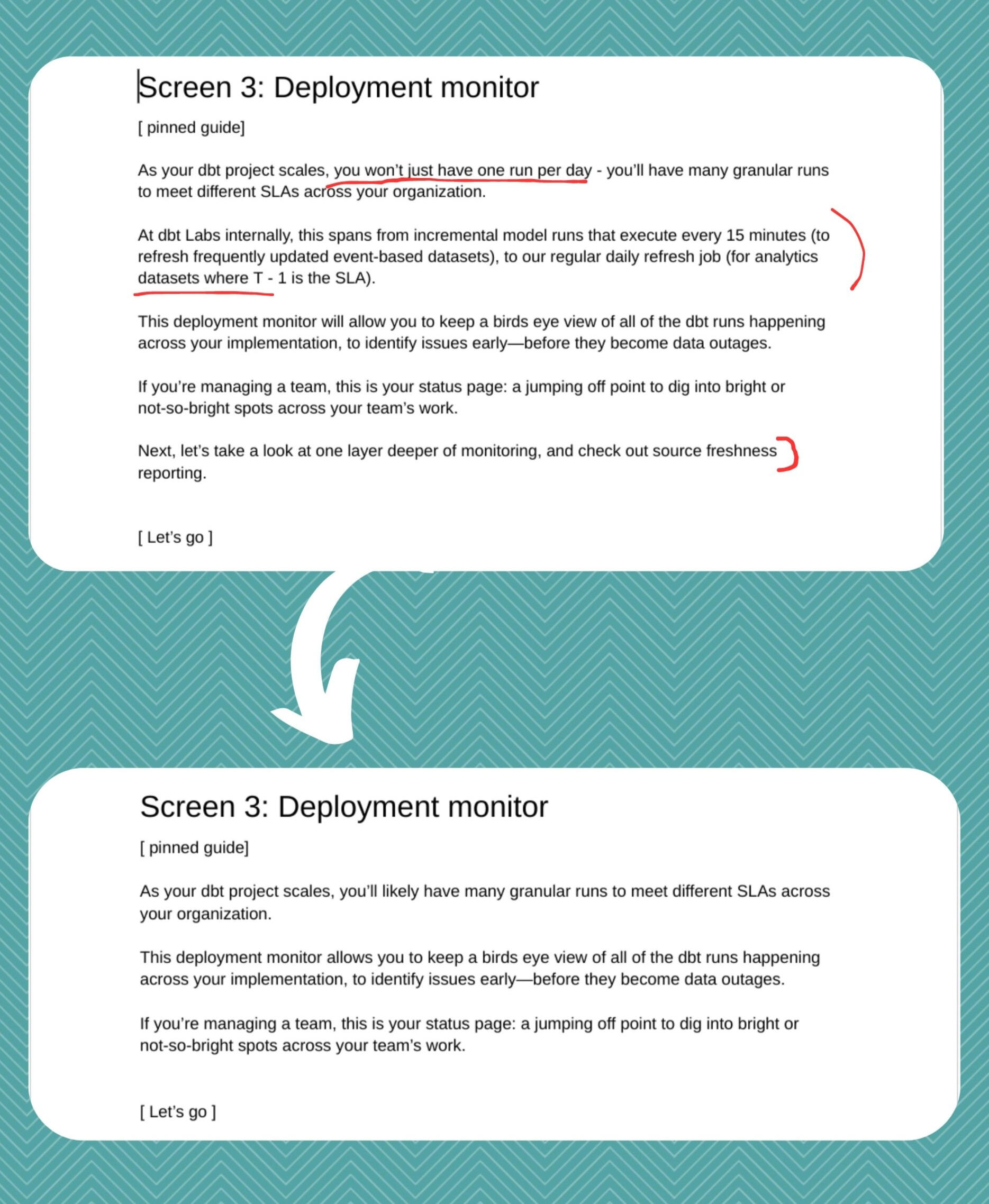 Challenge:dbt Labs prides itself on speaking to data practitioners in their own, often technical language. However, this tour sought engagement from less technically skilled stakeholders who needed to grasp dbt's key benefits without feeling disconnected.Insights:When I initially read through the tour, written by dbt's Head of Acquisition David Krevitt, I realized that the technical language might alienate our target persona and that the approach was too intensive for an introductory experience.Proposed Solution:I suggested edits that centered on our target user—a "big picture"-focused manager persona who prioritizes collaboration, efficiency, and team unity. I aimed to connect with this persona by centering these values and excluding technical details that could be alienating.